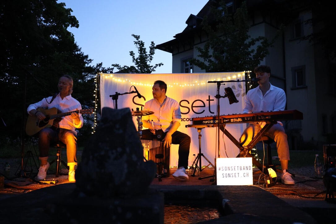 Wir sind eine Akustik-Pop-Band welche vor allem bekanntere Cover-Songs spielt und unser Set zwischendurch mit Eigenkompositionen aufmischt. Für eine angenehme Soundkulisse sorgen zwei Stimmen und drei Instrumente. Mal nur Gitarre, mal nur Piano, oft aber in Kombination und meistens in Begleitung von Percussion. Wir spielen sämtliche Songs live, ohne Playback und total ungefiltert. Die Musik von Sonset erinnert an eine leichte Sommerbrise, erzeugt gute Laune und Urlaubsgefühle.